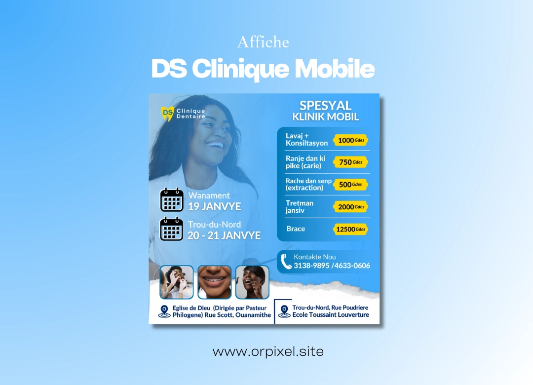 Création de supports d’affichage et de communication visuelle qui renforcent l’image de marque de la clinique, transmettent l’hygiène et le professionnalisme, et rassurent la patientèle.